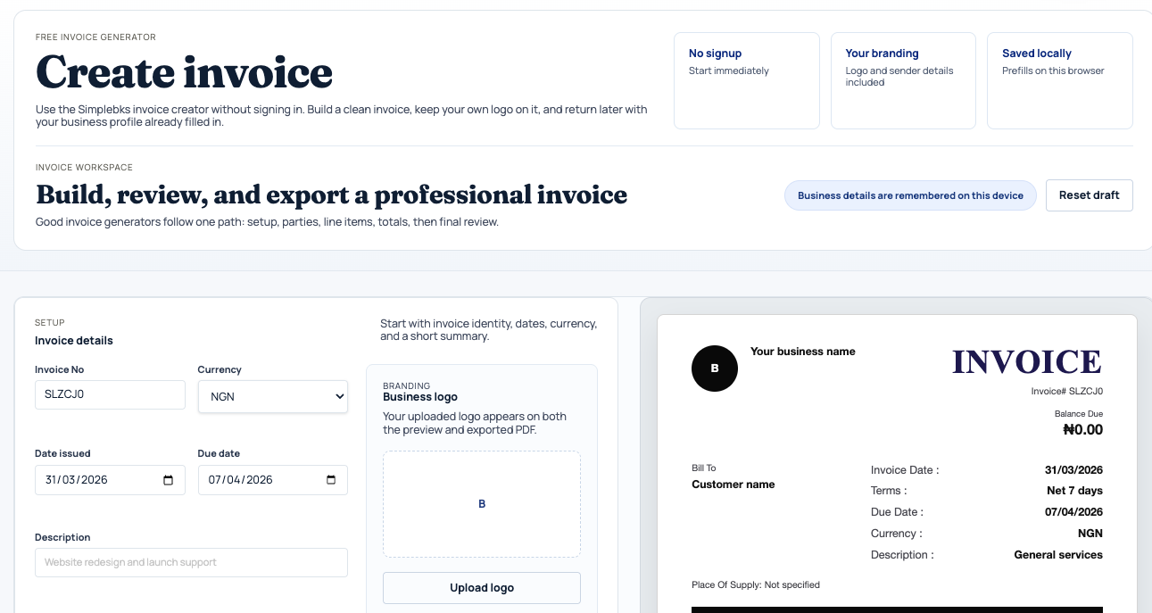 The Simplebks free invoice generator lets any Nigerian business owner create a professional, print-ready invoice in under 60 seconds. No account required. No payment. Nothing to install.